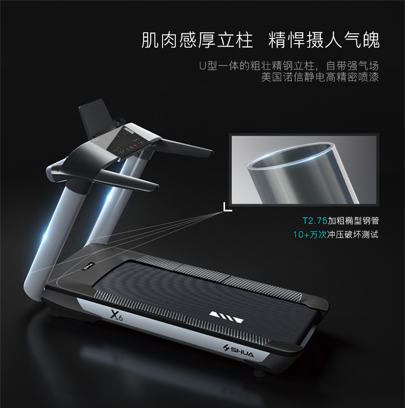 舒华家用跑步机SH-T6700(X6)采用18T+12T双层跑板,T2.2mm钻石纹的跑带,双层跑板全跑台减震,对您跑步中的膝盖进行全方位的呵护,选用接触式心率感应和无线心率感应等多种方式获取数据,跑步面积达520×1450mm,可承受130kg的使用者使用。